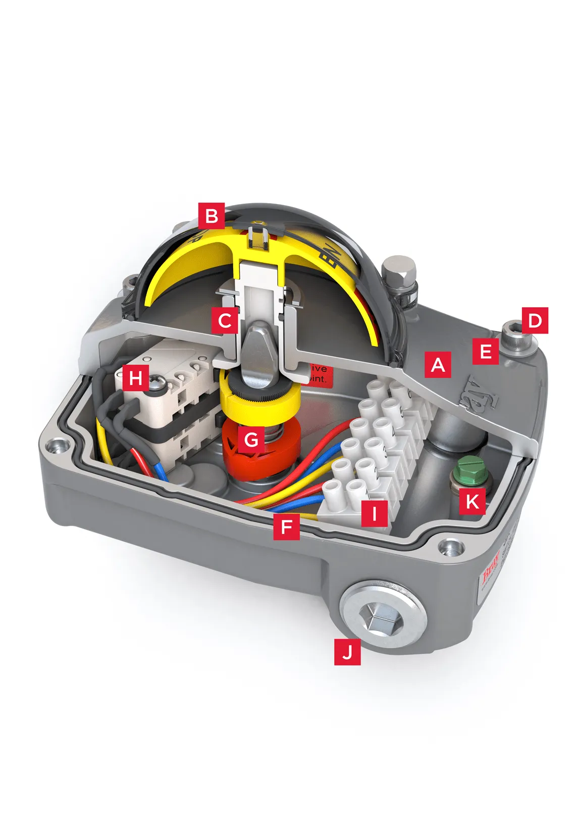 Indicador de posición de alta visibilidad: Equipado con un indicador tipo domo resistente a impactos que puede girar 90 grados para invertir las salidas visuales de abierto y cerrado sin necesidad de retirar la cubierta, manteniendo así la integridad del cableado interno.