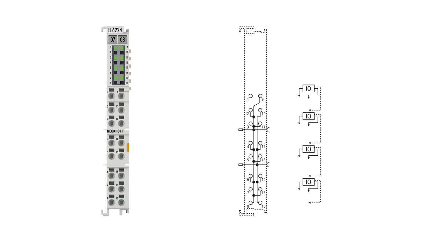 El terminal IO-Link EL6224 permite la conexión de hasta cuatro dispositivos IO-Link, como actuadores, sensores o combinaciones de ambos. Se utiliza una conexión punto a punto entre el terminal y el dispositivo. El terminal se parametriza mediante el maestro EtherCAT . IO-Link está diseñado como un enlace inteligente entre el nivel de bus de campo y el sensor, lo que permite el intercambio bidireccional de información de parametrización a través de la conexión IO-Link. La parametrización de los dispositivos IO-Link con datos de servicio puede realizarse desde TwinCAT mediante ADS o, de forma muy cómoda, mediante la herramienta de configuración IO-Link integrada.