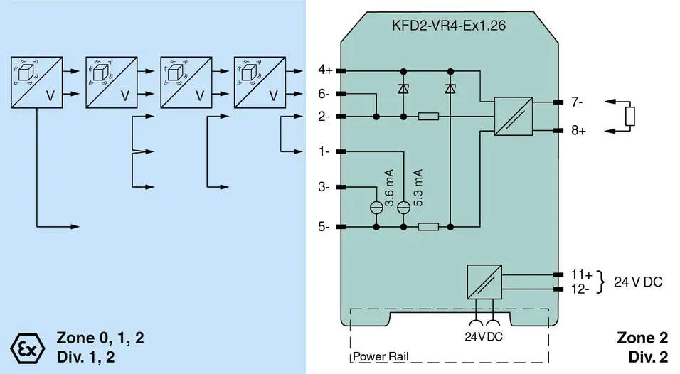Esta barrera aislada se utiliza para aplicaciones de seguridad intrínseca. Proporciona una salida flotante para alimentar un sensor de vibración (p. ej., Bently Nevada) o un acelerómetro en una zona peligrosa y transfiere la señal de tensión desde dicho sensor a la zona segura.
