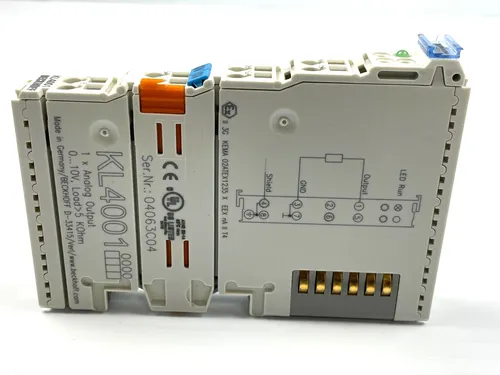 El terminal de salida analógica KL4001 genera señales en el rango de 0 a 10 V. La tensión se suministra al nivel de proceso con una resolución de 12 bits y está aislada eléctricamente. Los canales de salida del terminal de bus tienen un potencial de tierra común. El KL4001 es especialmente adecuado para señales con potenciales de tierra aislados eléctricamente. Los LED de funcionamiento indican el intercambio de datos con el acoplador de bus.