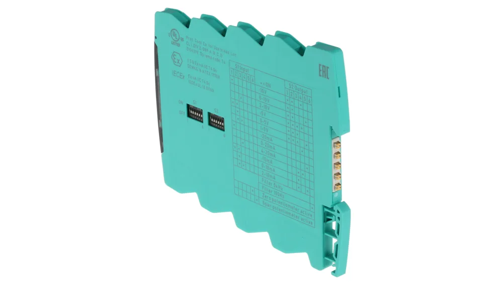 Este acondicionador de señal proporciona aislamiento galvánico entre los circuitos de campo y los de control. El dispositivo alimenta a transmisores de 2 y 3 hilos, y también se puede utilizar con fuentes de corriente. El dispositivo proporciona las siguientes señales estándar en la salida: – señal de 0/4 mA … -20 mA – señal de 0/2 V … 10 V El dispositivo se puede configurar fácilmente mediante interruptores DIP. El dispositivo puede alimentarse mediante terminales o bus de alimentación. |